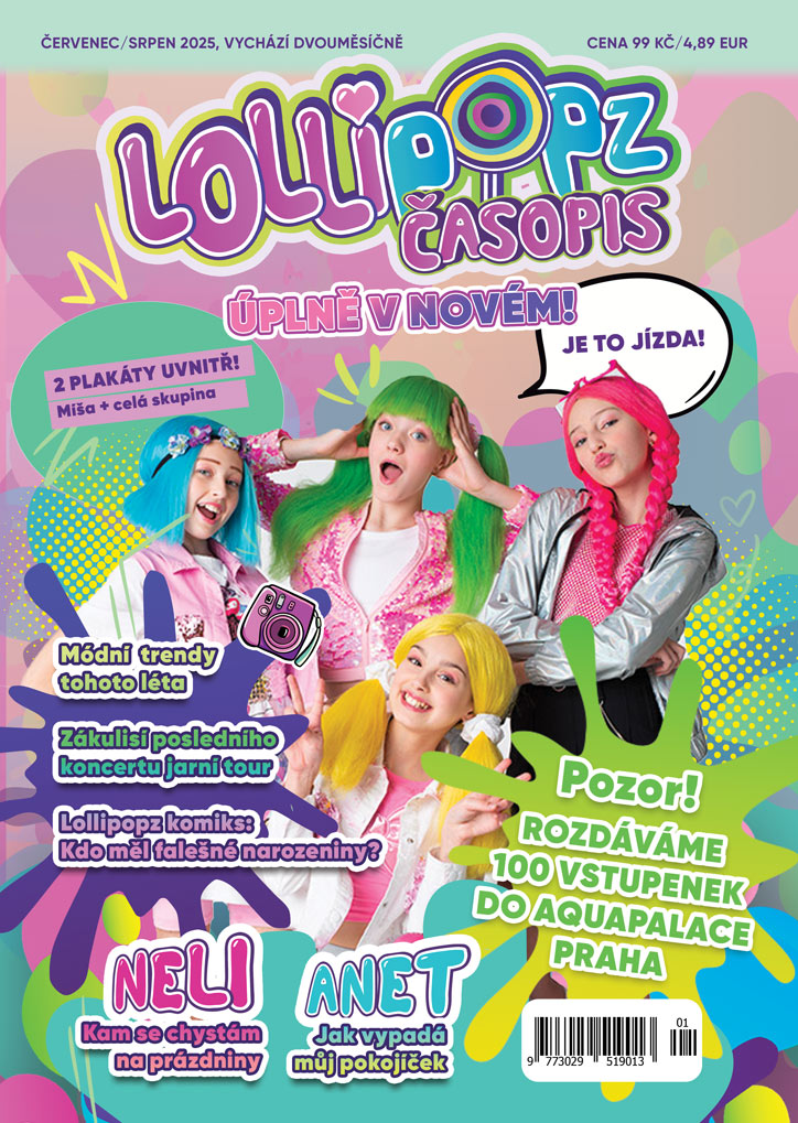 Nedávno jste se mohli seznámit s novým časopisem Kája a Bambuláčkův svět vydavatelství Kawaii Production, které nyní přichází s dalším novým titulem a tentorkát zaměřeným na oblíbenou hudební skupinou Lollipopz. Časopis je tak určen pro všechny fanoušky tohoto dětského hudebního fenoménu. Obsahovat bude novinky, informace ze zákulisí, tajnosti i radosti členek populárních Lollipopz! V prnvím vydání, které vyjde 25.6. se můžete těšit na rozhovor s Nali o jejích plánech na prázdniny, dozvíte se, jak to vyapdá u Anet doma a v zákulisí posledního koncertu a čeká na vás také komiks a dva plakáty do pokojíčku.